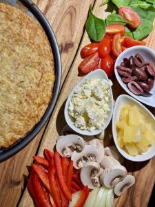 ⧽ Increase the oven temperature to 220°C, add toppings of choice and bake for another 10 minutes, or until the cheese is melted and golden brown.